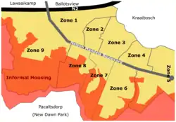 The Group Areas Act (Act 41 of 1950) was one of the cornerstones of Apartheid policy that was implemented by the National Party. The Act assigned racial groups to different residential and business sections in urban areas. The Group Areas Act led to a massive programme of forced removals in South Africa and subsequently in George as well.[4] Under the guidance of Apartheid legislation, George implemented the Group Areas Act of 1950 which led to Rosemoor and Pacaltsdorp being declared Coloured Group Areas. Additional townships were established to accommodate people who were classified as coloured and had been forcibly removed from other areas. George fell under the Cape Province Coloured Labour Preference Act of 1957. Any employer wishing to employ a black worker was required to obtain a Coloured Labour Clearance Certificate from the department of manpower stating that no suitable coloured person is available for the position. The authorities had not made any plans to attempt to provide land or housing for black people before acquiring Harvey's Bay (an informal settlement largely occupied by black people in 1976) for the purpose of housing black municipal workers. Harvey's Bay came to be known as Lawaaikamp and the municipality provided it with basic services such as toilets and refuse removals.