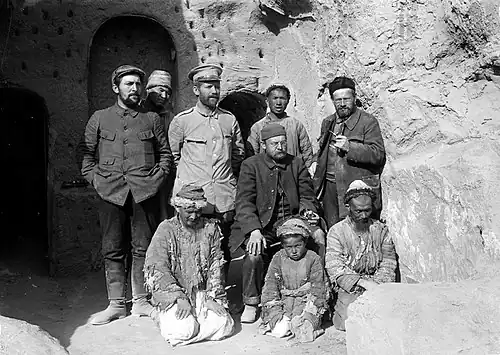 ![]() German Expedition at Kizil Caves, in front of Cave 4, in 1906. Bartus is standing in uniform. | |