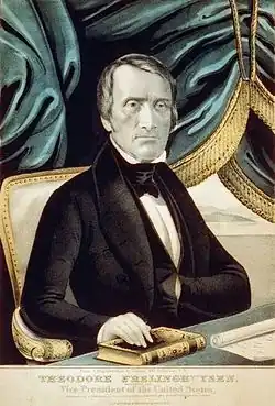 Frelinghuysen was selected as Clay's running mate at the 1844 Whig National Convention. In the 1844 election, the Whig ticket was narrowly defeated by the Democratic ticket of James K. Polk and George M. Dallas. Frelinghuysen served as president of New York University from 1839 to 1850, and as president of Rutgers College from 1850 to 1862. Upon its incorporation in 1848, Frelinghuysen Township, New Jersey, was named after him.[1]