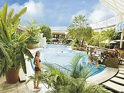 The main building is connected by the Palazzo Veneziano to the old sauna area, which houses both saunas and another outer pool with Jacuzzi beds. In the sauna garden there are two other saunas.[11][12]