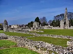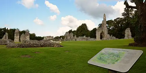 Its ruins (including the lower walls of the church and cloister, along with the impressive shell of the priors' lodging and, reached by a pathway from the main site, an almost complete 14th-century gatehouse) are open to the public as an English Heritage site. The priory and gatehouse are Grade I listed buildings.[3][4] The ruins are reputedly haunted and were the subject of an episode of the television series Ghosthunters.