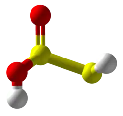 Thiosulfurous acid is a hypothetical chemical compound with the formula HS−S(=O)−OH or HO−S(=S)−OH. Attempted synthesis leads to polymers.[3] It is a low oxidation state (+1) sulfur acid.[4] It is the Arrhenius acid for disulfur monoxide. Salts derived from thiosulfurous acid, which are also unknown, are named "thiosulfites", "thionosulfites" or "sulfurothioites". The ion is S=SO2−