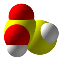 Other possible isomers are dihydroxydisulfane or hypodithionous acid HOSSOH, a linear chain, and thiothionyl hydroxide (S=S(OH)2) a tautomer where the hydrogen has moved from a sulfur to an oxygen.[5] HOSSOH can have two different rotamers with symmetry C1 and C2. The isomer with one hydrogen on sulfur and one on oxygen is the most stable according to calculations.[6]