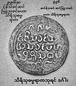 ![]() Arakan King Thiri Thudhamma Raza's Coin stamped in Arakanese Era 996 | |||||