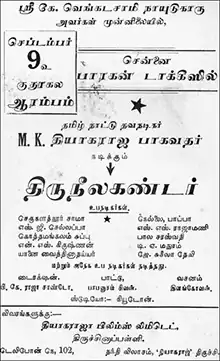 - ^ Forgotten Tamil Cinema - The Early Years [@oldtamilcinema] (9 January 2019). "Thiruneelakantar (1939) — After Chitamani (1936), M.K.Thyagaraja Bhagavathar was on a roll. Ambikapathi, Thiruneelakandar, Sivakavi and reached his pinnacle in Haridas (1944). MKT was a great singer, but is generally criticized for his acting. Not this one, though" (Tweet) – via Twitter.