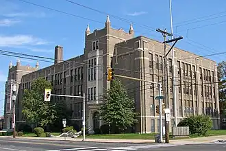 This historic building was designed by Irwin T. Catharine and built between 1929 and 1930. It is a three-story, eight-bay, brick building that sits on a raised basement. Created in the Late Gothic Revival style, it features entrances with arched stone surrounds, brick piers with terra cotta capitals, and a crenellated battlement with four small towers. Additions were built in 1931 and 1954.[2]