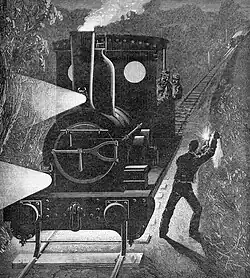 Once home, Curnow collected matches and a candle, and borrowed his sister's red scarf. Curnow had been struck by the sight of the scarf while imprisoned at Stanistreet's, and thought it would make a "splendid danger signal".[12] He intended on riding along the railway line to Benalla, hoping to raise the alarm there before the train left. His wife Jane begged him not to go for fear that they would all be killed by the outlaws. To protect them while he completed his mission, Curnow took his family to his mother-in-law's nearby farm, but Jane insisted on returning home. There, Curnow lied and said he had abandoned his plan. Satisfied, Jane went to bed, allowing Curnow to leave for the railway line at 2:30 am.[13] As he did so, he heard the approach of what turned out to be the pilot engine. Curnow reached the line in time and held up the lighted candle behind the scarf. The guard stopped the pilot after noticing a "tiny red glow in the darkness". Curnow called out, "It's the Kellys!", and said the track had been sabotaged beyond Glenrowan station. He quickly returned home, fearing that at any moment he would be shot by the outlaws or their spies.[14]