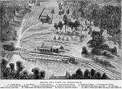 The special stopped behind the pilot engine, whose driver apprised the police of the situation. The locomotives then joined and crawled along the line to Glenrowan station.[15] The outlaws heard the train arrive and saw the police disembark and unload their horses. One hostage heard Kelly say, "By God, that bastard Curnow has deceived us."[16] A 12-hour siege unfolded, during which the gang, clad in armour, engaged the police in a shootout. By the afternoon of 28 June, several hostages had been fatally shot, Kelly had been wounded and captured, and the other three gang members were dead.