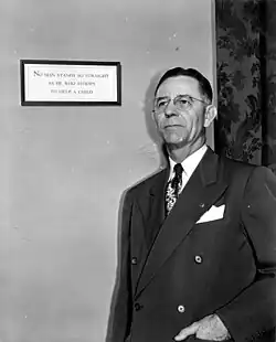 He is pictured in 1951 along with a plaque showing his motto "No man stands so straight as he who stoops to help a child.".[10]