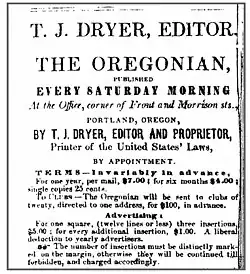 Coffin and Chapman provided a crude log cabin to Dryer to set up his press and establish his newspaper office.[3] He was able to release the first issue of his publication, The Weekly Oregonian, on December 4, 1850 — about two weeks after the launch six miles to the south in Milwaukie, Oregon by Lot Whitcomb, The Western Star, a rival publication.[4]
