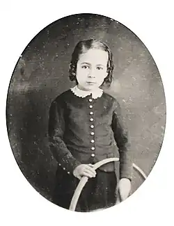 Eakins used photography for his own private ends as well. Aside from nude men, and women, he also photographed nude children. While the photographs of the nude adults are more artistically composed, the younger children and infants are posed less formally. These photographs, that are "charged with sexual overtones", as Susan Danly and Cheryl Leibold write, are of unidentified children.[50] In the catalog of Eakins' collection at the Pennsylvania Academy of the Fine Arts, photograph number 308 is of an African American child reclining on a couch and posed as Venus. Both Saidiya Hartman and Fred Moten write, respectively, about the photograph, and the child that it arrests.[51][52]