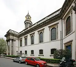 In 1813 he had begun a chapel-of-ease, designed to accommodate a considerable congregation, on the south side of the New Road in London, for the parish of St Marylebone. It was a basically rectangular building, with two small wings placed diagonally at the liturgical east, and was intended to have an Ionic portico surmounted by a group of figures and a cupola. However, before completion, it was decided that it would make a suitable new parish church for of St Marylebone. Hardwick altered the design to create a suitably grand facade, with a Corinthian portico six columns wide, based on that of the Pantheon in Rome, and a steeple, its top stage in the form of a miniature temple, surrounded by eight caryatids. The interior, with two tiers of galleries supported on iron columns, was left unaltered.[1]
