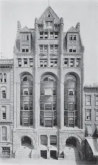 The ground floor, which was built of rusticated sandstone from Gatelawbridge, Scotland,[1] featured two large, recessed Roman archways, one on each wing, which served as the main entrances. The upper stories of the facade were constructed of moulded brick and terra cotta.[1] At the top of the building was an "enormous" bust of Thomas Jefferson, set in an alcove.[6][8]