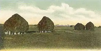Thomas Leavitt died at Hampton, New Hampshire, on November 28, 1696, while still residing on the land granted to his wife's first husband. His widow died three years later, in 1699. The couple had four sons,[10] all of whom lived nearby and who left descendants who still reside in the area today.[11] In his will Leavitt had made provisions for his wife, leaving her land and "two cows, two swine, three sheep, my brass and puter [pewter], the thirds of all my corne."[12] Leavitt also carefully disposed of his tools, leaving his son Aretas "half the cross cut saw," with son John receiving "the other half the tools mentioned with all carpenter tools and his house and ground."[13] The will makes note of 219 acres (0.89 km2) of land, including 5 acres (20,000 m2) of swampland, owned by Leavitt which he left to his wife and children.[14]