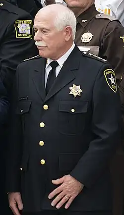 In Thomas Hodgson's official Bristol County Sheriff portrait from 2003, he is wearing a tie that resembles the Confederate flag. In 2020, community groups called for his resignation over his ties to white supremacy. Hodgson denied the tie was connected to the Confederacy and said he would continue to wear the necktie.[35] Senator Ed Markey tweeted, "No one, especially someone in law enforcement, should be wearing confederate symbols and doubling down on them when called out about it."[36][37]