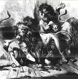 A very shocking affair took place last night in Bolton ... Part of the performance consists of a 'lion hunt,' during the course of which five large lions are put through a variety of movements by a man, dressed in a French uniform [sic], whose name is given in the bills as 'Massarti', but whose real name is Thomas Macarte... Last night, about half-past ten o’clock, the last representation in connection with the 'farewell visit' of the establishment was given, and during its progression Macarte slipped and fell to the floor while engaged in a large cage with the five full grown lions. One of the largest of the animals, a black Barbary lion, immediately sprang upon him with a terrific roar and was quickly followed by its companions. A horrible scene ensued. Within the den a frightful tragedy was enacted, the cries of the unhappy man struggling in the fangs of the savage brutes, being scarcely heard amid their roaring. Outside the cage a scene scarcely less appalling was witnessed. In the large assemblage of visitors, stalwart men shrieked, women tore their hair and fainted, and many were unable to seek their homes until a considerable time had elapsed. Macarte was rescued from the lions as quickly as possible but ere this could be done he was frightful torn by their teeth and claws, his legs, head, and hands being lacerated to such a degree that the flesh was completely torn away from the bones.[7]