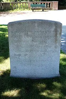 Transcription of Watertown marker: "HERE BY THE ANCIENT FORD THE LANDING AND THE WEIR WAS THE HOMESTALL OF THOMAS MAYHEW: A LEADER IN WATERTOWN AFFAIRS FROM 1635 TO 1645. AFTERWARDS WITH HIS SON, THE REV. THOMAS MAYHEW, HE LABORED AMONG THE INDIANS AT MARTHA'S VINEYARD."