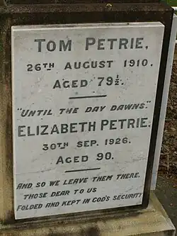 Petrie died at Murrumba on 26 August 1910. He was buried in Lawnton Cemetery.[11] He was survived by his wife (who died aged 90 on 30 September 1926) and by two sons and five daughters of their nine children. Though Murrumba had been reduced to 3000 acres (12 km2) the family kept the property until 1952. In 1910 the name of the North Pine district was changed to Petrie in his honour.