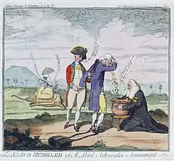 Sir Thomas Rumbold, 1st Baronet (15 January 1736 – 11 November 1791) was a British administrator in India and politician who sat in the House of Commons between 1770 and 1790. He served as Governor of Madras from 1777 to 1780. He became infamous for his corruption and, for in effect stealing, the ring of the Nawab of Arcot.[2] He brought home from India 1.5 million pagodas (a pagoda was worth eight shillings) or about £600,000 (at that time) and was a classic example of a nabob. Attempts were made to investigate the misdemeanour by Henry Dundas but the case did not make much headway.