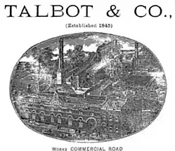 Talbot founded the Talbot Mineral Water Company in 1845. The firm had premises in Ladybellegate Street from at least 1867 and occupied some of the buildings of the former Blackfriars monastery and built some new buildings along Commercial Road. In 1873 the firm also had premises at 48 Northgate Street. It later became Talbot Bottlers (Gloucester) Limited.[7]