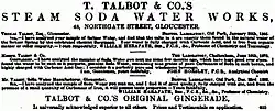Thomas Talbot was born in Portsea, Hampshire, in 1819 to Thomas and Maria Talbot.[1] He had a sister Eliza who became a governess.[2] He married Ann Ratcliffe Buston or Burton in Gloucester in 1845.[3][4] In the 1851 census he was shown as a "Soda water manufacturer and grocer" at 45 Lower Northgate Street.[2] He had daughters Amelia and Ann, and sons Thomas and Edward.[5] In the 1881 census he was shown as a "Mineral Water Manufacturer Master Employ 9 Men 4 Boys" residing at 4 Commercial Road.[6]