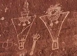 The Thompson Wash Rock Art District (which is also referred to as the Sego Canyon Rock Art Interpretive Site by the Bureau of Land Management) is an archeological site located in Thompson Canyon (about 3.5 miles [5.6 km] north of Thompson Springs) that was named after Thompson Wash and is listed on the National Register of Historic Places. The district includes several well-preserved groups petroglyphs (images etched into the rock surface) and pictographs (images painted onto the rock surface) left by early Native Americans in three different styles (each with their own panel): Fremont, Ute and Barrier Canyon.[13][14] As such it provides fairly rare opportunity to compare all three the styles in one location,[15] particularly a site that is easily accessible.[16] The Fremont culture thrived from A.D. 600 to 1250 and was contemporary with the Anasazi culture of the Four Corners area. The Archaic period dated from 7000 B.C., while the Barrier Canyon period from around 400 A.D., and the Ute tribe dating from A.D. 1300.