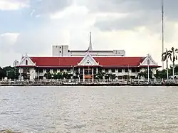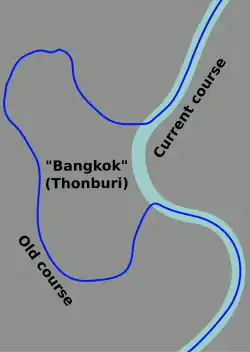 Thonburi (Thai: ธนบุรี) is an area of modern Bangkok. During the era of the Kingdom of Ayutthaya, its location on the right (west) bank at the mouth of the Chao Phraya River had made it an important garrison town, which is reflected in its name: thon (ธน) a loanword from Pali dhána 'wealth', and buri (บุรี), from púra, 'fortress'.[2] The full formal name was Thon Buri Si Mahasamut (กรุงธนบุรีศรีมหาสมุทร 'City of Treasures Gracing the Ocean'). For the informal name, see the history of Bangkok under Ayutthaya.