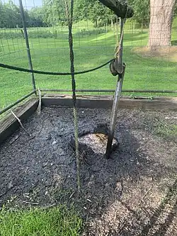 A high fence surrounds the Thorla-Mckee Well. Oil, gas, and brine seep from the well-head. Parts of the original wood casing are visible. Above the well sits a replica spring-pole.