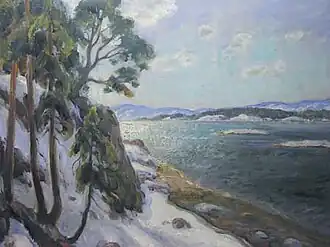 He studied under Hans Gude in Berlin between 1886 and 1887 and Fernand Cormon in Paris between 1889 and 1891. He was inspired by many different styles at different points in his career, including Naturalism, Neo-romanticism, Realism and Impressionism. He is represented with thirteen works in the National Gallery of Norway.[2]