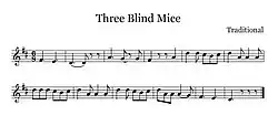 "Three Blind Mice" is an English nursery rhyme and musical round.[1] It has a Roud Folk Song Index number of 3753.