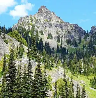 Three Way Peak is a 6,796 feet (2,071 m) summit located on the eastern border of Mount Rainier National Park. It is also on the shared border of Pierce County and Yakima County in Washington state. Three Way Peak is situated 0.42 mi (0.68 km) north of Cupalo Rock on the crest of the Cascade Range. Its nearest higher peak is Crystal Mountain, 0.56 mi (0.90 km) to the northwest.[1] Chinook Peak is 0.8 mile to the southwest. Precipitation runoff from Three Way Peak drains into tributaries of the White River and Naches River.[1]