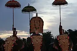 - Flag-hoisting and lowering: The temple festival begins on the first day (Atham) with the Kodiyettu (കൊടിയേറ്റ്) ceremony, which is a flag-hoisting ceremony common in festivals in temples in Kerala.[17] The festival ends on the 10th and final day, which starts off with a symbolic welcome of the Asura king Mahabali.[6] The closing of the festival is marked with the lowering of the flag and bathing of the idol, referred to as Aarattu (ആറാട്ട്).[17]
