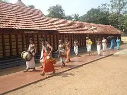 The main temple festival is during the Onam season, which falls on the month of August or September and is the most important event of the religious calendar here.[5] After East India Company and Marthandavarma annexed the territory from Kingdom of Kochi, the Onam festival was jointly organized by the 61 Naduvazhis (local rulers) under the leadership of the Maharaja of Travancore, till India regained independence. Communal harmony continues to be the hallmark of the celebrations, with people belonging to different religions turning out in large numbers for the Onasadya or the Onam feast in keeping with the spirit of the festival.[6][7] Apart from Onam, the temple also observes important festivals in the Hindu calendar such as Vishu, Makara Sankranti,[8] Navarathri and Saraswati Puja.