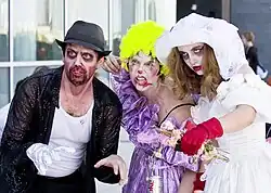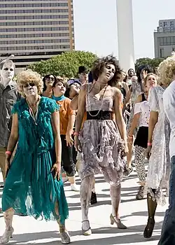 Thrill the World's official website expected the 2007 event to include 60 separate dancing events in 15 countries.[3] On the day of the performance, October 27, 2007, it was revealed that 1,722 people in 80 cities from 17 countries had actually participated.[4][5][6] The dancers in Irvine, California's event ranged from teenagers to women in their late 50s. One female participant danced to "Thriller" with her 4 ½-month daughter strapped to her waist. Another participant, 57-year-old Valerie Cardinal, wore a lime-green wig and scary makeup.[5] "This is more fun than ballet", she proclaimed. "It's life affirming, even though it's about death."[5] The Irvine event was organized by resident Tom Nguyen and dance instructor Jeremy Heckman. The pair arranged rehearsals and the main show in two weeks, upon hearing that a Canadian dance instructor was aiming for the "Largest Simultaneous Thriller Dance" world record.[5] During the event, Nguyen and Heckman collected donations for the American Red Cross, which would then be used to aid victims of the October 2007 California wildfires.[5] One of the wildfire victims, 26-year-old Kim Deans, participated in Irvine's "Thrill the World" event. At the time, Deans had been evacuated from her home and not allowed back.[5] She later spoke of the escapism in performing at the event. "It's a break – a physical and mental break. It was either this or Disneyland."[5]