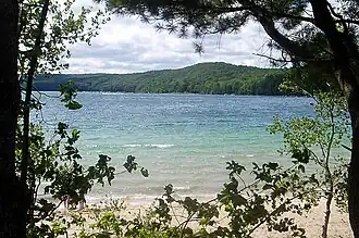The lake is nestled in the highlands east of the village of Boyne Falls, centered at 45°11′N 84°45′W / 45.183°N 84.750°W, and is surrounded by wooded hills. Because of its depth and the dearth of run-off into the lake, its waters are exceptionally clear. The lake is inhabited by splake, a stocked hybrid species (lake trout and brook trout), rainbow trout, yellow perch, smallmouth bass, northern pike, largemouth bass, smelt, and other panfish. Public access is available on the eastern shore of the lake in the form of a park with swimming beach, and on the southwestern shore in the form of a boat launch.