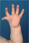 Thumb hypoplasia is a spectrum of congenital abnormalities of the thumb varying from small defects to complete absence of the thumb.[1] It can be isolated, when only the thumb is affected, and in 60% of the cases[2] it is associated with radial dysplasia[1] (or radial club, radius dysplasia, longitudinal radial deficiency). Radial dysplasia is the condition in which the forearm bone and the soft tissues on the thumb side are underdeveloped or absent.[3]