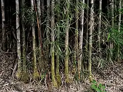 - Thyrsostachys siamensis Gamble - monastery bamboo, Thai bamboo, umbrella bamboo, Thai umbrella bamboo, umbrella-handle bamboo - Yunnan, Myanmar, Laos, Thailand, Vietnam; naturalised in Sri Lanka, Bangladesh, Peninsular Malaysia