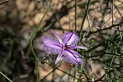 Thysanotus arenarius, commonly known as sand-dune fringed lily,[2] is a species of flowering plant in the Asparagaceae family, and is endemic to near-coastal areas of Western Australia. It is a clumped, rhizomatous, perennial herb with linear leaves, more or less prostrate stems, and umbels of two or three purple flowers with elliptic, fringed petals, narrowly linear sepals, six stamens and a curved style.