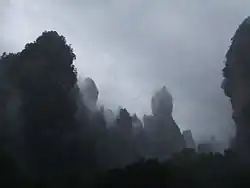 The mountains are quartz sandstone and were formed about 400 million years ago through irregular rising patterns of the earth's crust, and with about 318 million years of erosion these tall and skinny mountains were formed.[11] This geological formation belongs to the "New Cathaysian" tectonic system.