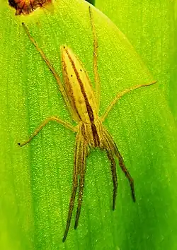 Tibellus oblongus, also called the oblong running spider or slender crab spider, is a spider with a Holarctic distribution. It does not spin webs, but instead actively hunts small insects, which it kills with venom.[1] T. oblongus lives in grassy habitats and can be preyed upon by larger spiders, such as wolf spiders like Hogna baltimoriana.[2]