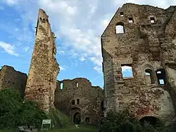 János Karácsonyi considered Mihalc was the son of Petke (a diminutive form of Peter), because of the frequent use of the name Peter in his branch.[23] Nevertheless, Vjekoslav Klaić presented a document which implies that Grab and Demetrius (I) were the sons of Petke.[25] Tamás Pálosfalvi argued that Petke was given no portion in Szencse lordship during the division of estates in 1231, while Mihalc's descendants were landowners there.[26] After Zerje died without male descendants, Paul (I) and his brothers Nicholas (II) and Peter (I) acquired Stupčanica Castle in 1314.[24] Initially, Paul was a supporter of Charles, like his cousins. He served as župan (or ispán) of Gerzence County in Slavonia in 1326–1327, plausibly appointed by Ban Mikcs Ákos. In the next year, in March 1328, he was referred to as ispán of Szana County, also in the service of the ban.[27] Together with his brother Nicholas, Paul took part in the siege of Sjenićak (Sztenicsnyák) in the autumn of 1327, when Mikcs captured the castle from the rebellious Babonić family.[26] Prior to 1332, Paul turned against Charles for unknown reasons and barricaded himself into the fort of Stupčanica, where from he constantly plundered the region and committed "innumerable sorts of evil" to the detriment of the king's supporters, until his capture and ultimate death in prison in 1330 or 1331.[26] Paul had no descendants, thus his estates, including Stupčanica Castle, were inherited by his brother Nicholas (II). He swore loyalty to Charles and handed over the fort to the king,[24] and was accordingly pardoned together with his son John (V) and his nephews, Nicholas (III), Peter (II), Paul (II) and Demetrius (III), sons of the late Peter (I).[26][23] They were able to retain their possessions, and Nicholas (II) was granted some additional portions.[23] A lesser branch of the Szencsei (Svetački) family descended from the Mihalc branch, but they remained insignificant local nobles in comparison to Theobald's branch (see below) and their genealogy is highly uncertain due to lack of sources.[28]