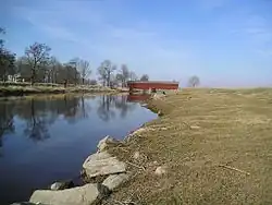 Tidan River in Ettaks strömmar nature reserve, looking upstream with service bridge in background -