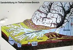 - Geological features (sandur): On the site of the Tiefwarensee dead ice was once covered by sandur that was pushed over it. The present lake hollow subsided with the melting away of the ice. The meltwaters escaped from the inland ice under high pressure. As the streams broadened they lost speed. Because their transport capacity was no longer sufficient, the material they carried with them was deposited as sediment. This included glacial erratics as well as fine-grained material.