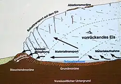 - Geological features (terminal moraines): At this station glacial till (Geschiebemergel) and fine-grained silt (Schluff) may be seen. The terms ground moraine (Grundmoräne), ablation moraine (Ablationsmoräne) and push moraine (Stauchendmoräne) are explained. A distinction is made between recessional or deposited end moraines (Satzendmoräne, material left behind by the inland ice when the ice melts) and push moraines (Stauchendmoräne, till heaped up ahead of the glacier during its advance).