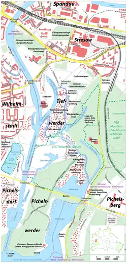 To the west of the Havel channel lies the former lowland Börnicker Lake, also known as Birnicker Lake. On its marshy meadows, the Spandauer Südpark (Spandau South Park) was established in 1923, featuring the Südparksee Lake. The channel continues to flow towards Scharfen Lanke and Grimnitzsee, which are located on the opposite side of the Havel, facing the Tiefwerder Wiesen. South of the Heerstrasse, the LSG Tiefwerder-Wiesen is followed by the landscape conservation area Pichelswerder, after which the Havel, which is canalized at Tiefwerder, opens into the southern Berlin Havel Lake chain. The Tiefwerder meadows are assigned to the Brandenburg-Potsdam Havel area (No. 812) in the natural space unit D 12a (East German Lowlands, Central Brandenburg Plates and Lowlands).[1][2]