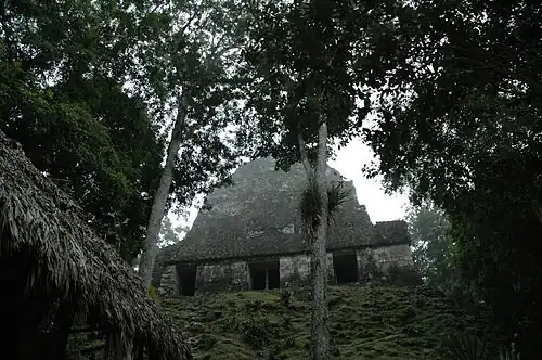 Tikal Temple VI (also known as the Temple of the Inscriptions and Structure 6F-27)[1] is a Mesoamerican pyramid in the ruins of the major Maya city of Tikal, in the Petén department of northern Guatemala. Temple VI is located at the southeastern end of the Mendez Causeway, which links the temple plaza with the site core.[2] The temple faces west onto a walled plaza.[3] The existence of the temple was first reported in 1951 by Antonio Ortiz on behalf of the Instituto de Antropología e Historia (IDAEH - "Institute of Anthropology and History").[4] The roof comb of the temple is inscribed on its sides and back with a lengthy hieroglyphic text.[5] The pyramid's summit superstructure contains two chambers,[3] and the highest surviving portion of the temple's roof comb stands 12 metres (40 ft) high.[6] The pyramid superstructure is accessed via three west-facing doorways.[7] The triple doorway and interior layout of the chambers suggest that Temple VI was in fact a palace-type structure rather than a temple.[8]