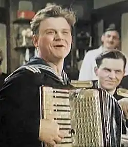 Having "adopted the optimistic, dramatic and unabashedly lyrical style favored by Soviet leaders",[6] Khrennikov shot to fame in 1941, with the "Song of Moscow" ("Свинарка и пастух", meaning "Swineherd and Shepherd") from his music score for the popular Soviet film They Met in Moscow,[7] for which he was awarded the Stalin Prize. In 1941, Khrennikov was appointed music director of the Central Theatre of the Red Army, a position he would keep for 25 years.