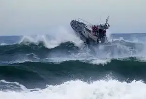 The stone breakwater at the mouth of Tillamook Bay is only 400 meters wide.[1] During heavy weather the waves off the harbor entrance can be 10 metres (33 ft) high, making entering the harbor dangerous. During the July 4th weekend of 1980 Richard Dixon, the United States Coast Guard coxswain of a 44-foot Motor Lifeboat, led two daring rescues off the Tillamook Bay breakwater, for which he was awarded two Coast Guard Medals.[2]