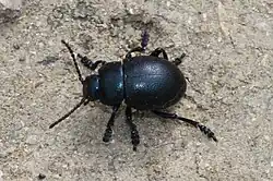 T. goettingensis is a shiny blue-black, violet-copper, or black beetle measuring 8–13 mm in length.[1][2] Visually it may be confused with Timarcha tenebricosa, but this beetle is larger (11–18 mm) and is more constricted on the base of its pronotum than T. goettingensis.[3] Timarcha goettingensis may also be visually confused with Chrysolina sturmi.[1]