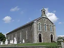 Tinahely's parish church, St. Kevin's church, lies 2 km to the east of the village in the townland of Kilaveny overlooking the valley of the Derry stream. The church was erected in 1843 when it replaced another structure located in the adjacent townland of Whitefield which had been burned down on 11 November 1798 by Yeomen soldiers in reprisal for local activity during the 1798 Rebellion. The Whitefield church was replaced by a temporary wooden structure until the erection of St. Kevin's church. The original structure had been erected during the Penal Laws in 1700 and was cruciform in style with two transepts and a nave. Nothing now remains of the original church except for the cemetery that was attached to it. No burials have taken place in the cemetery since the mid-1900s. In the Jubilee Year 2000, parishioners erected a carved commemorative limestone marker on the site of the original church, in the present Whitefield Cemetery, setting out the above history.